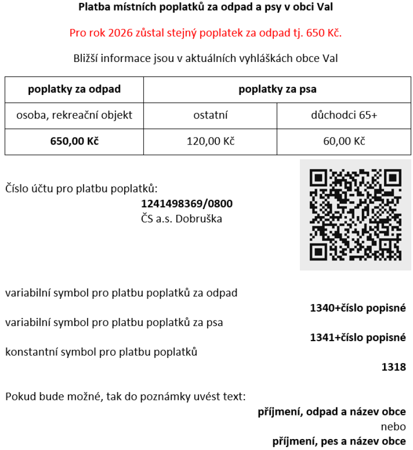 MÍSTNÍ POPLATEK ZA KOMUNÁLNÍ ODPAD A PSA NA ROK 2026 - (Poplatek zůstal stejný tj. 650 Kč/osoba) lze hradit i na OÚ Val v úředních hodinách od 7.1.2026 do 31.3.2026.